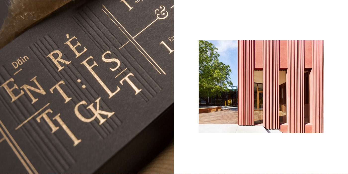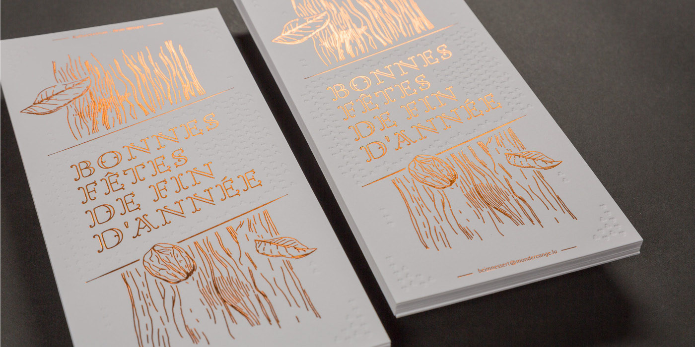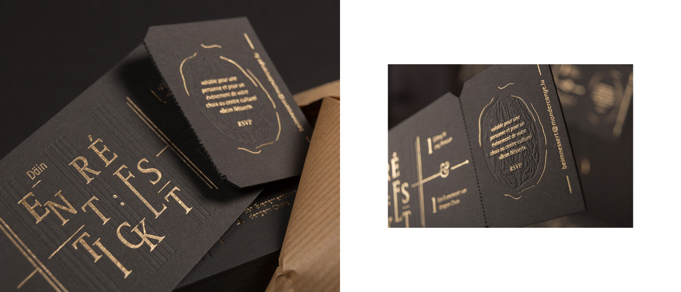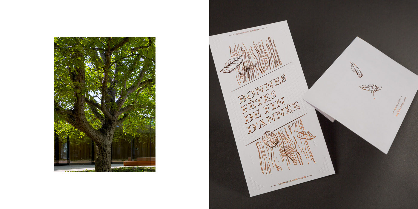 Letterpress prints for the cultural center «Beim Nëssert». Inspired by the architectural features of the building itself, we designed these festive and luxury letterpress cards.