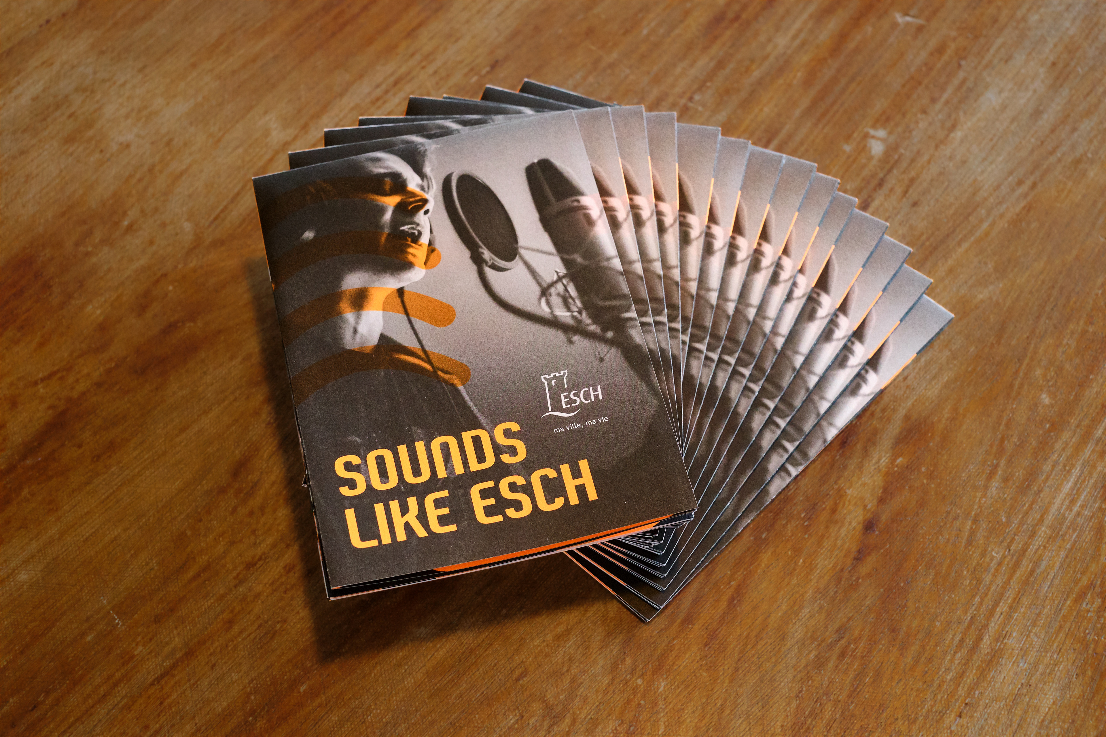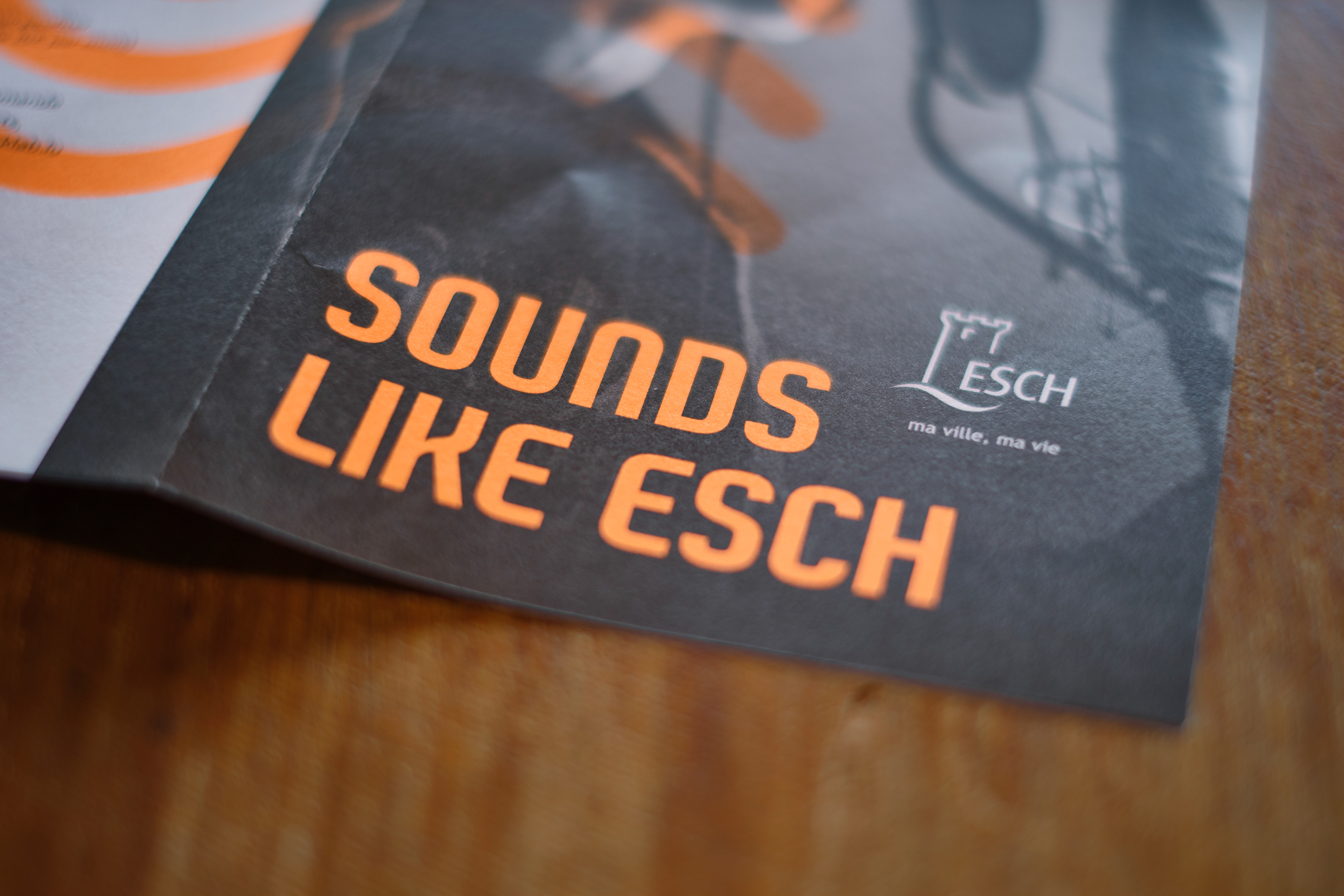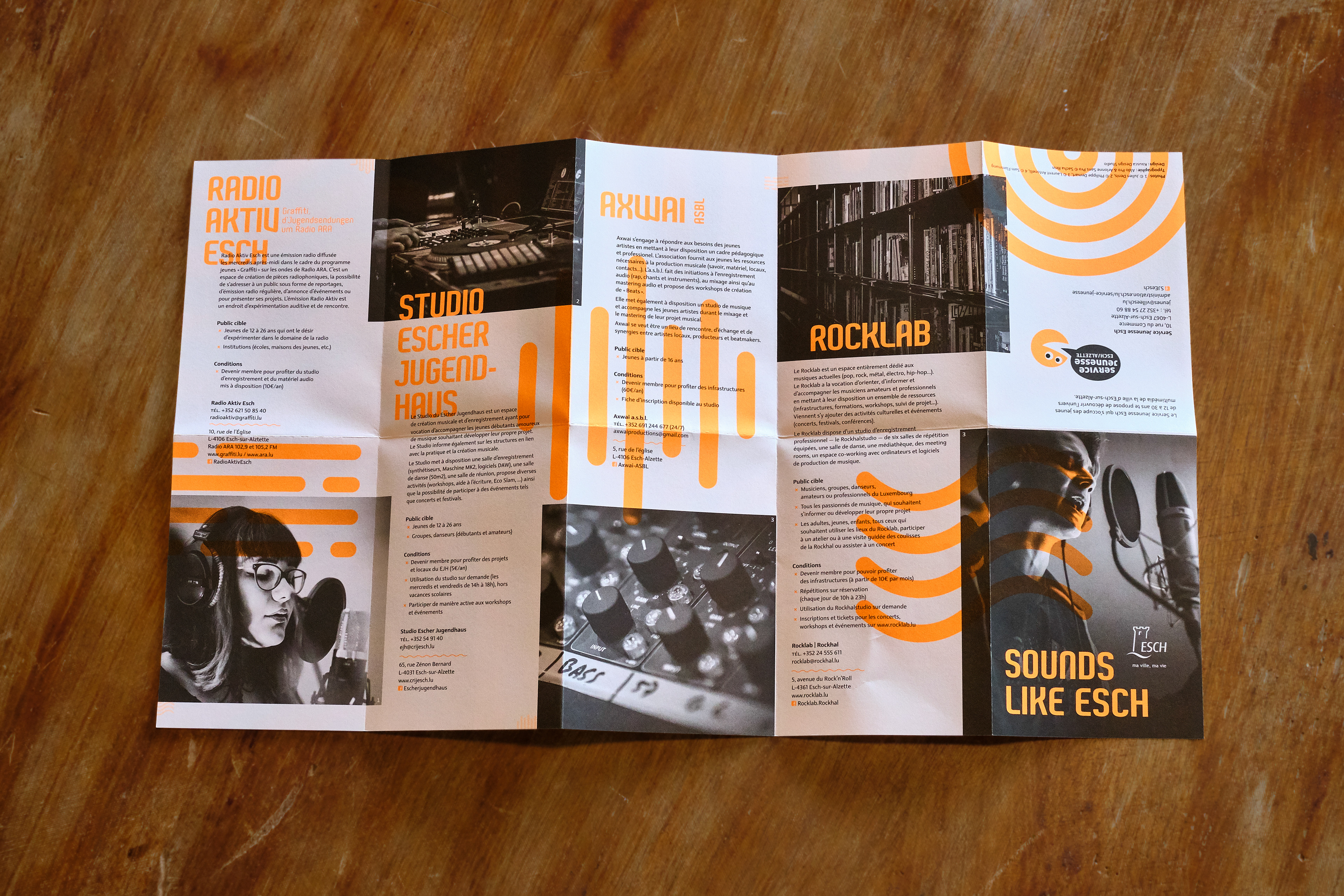 Foldout leaflet for the youth of Esch-Alzette showing the different sound production opportunities the city is offering. Information on one side, poster on the other side.