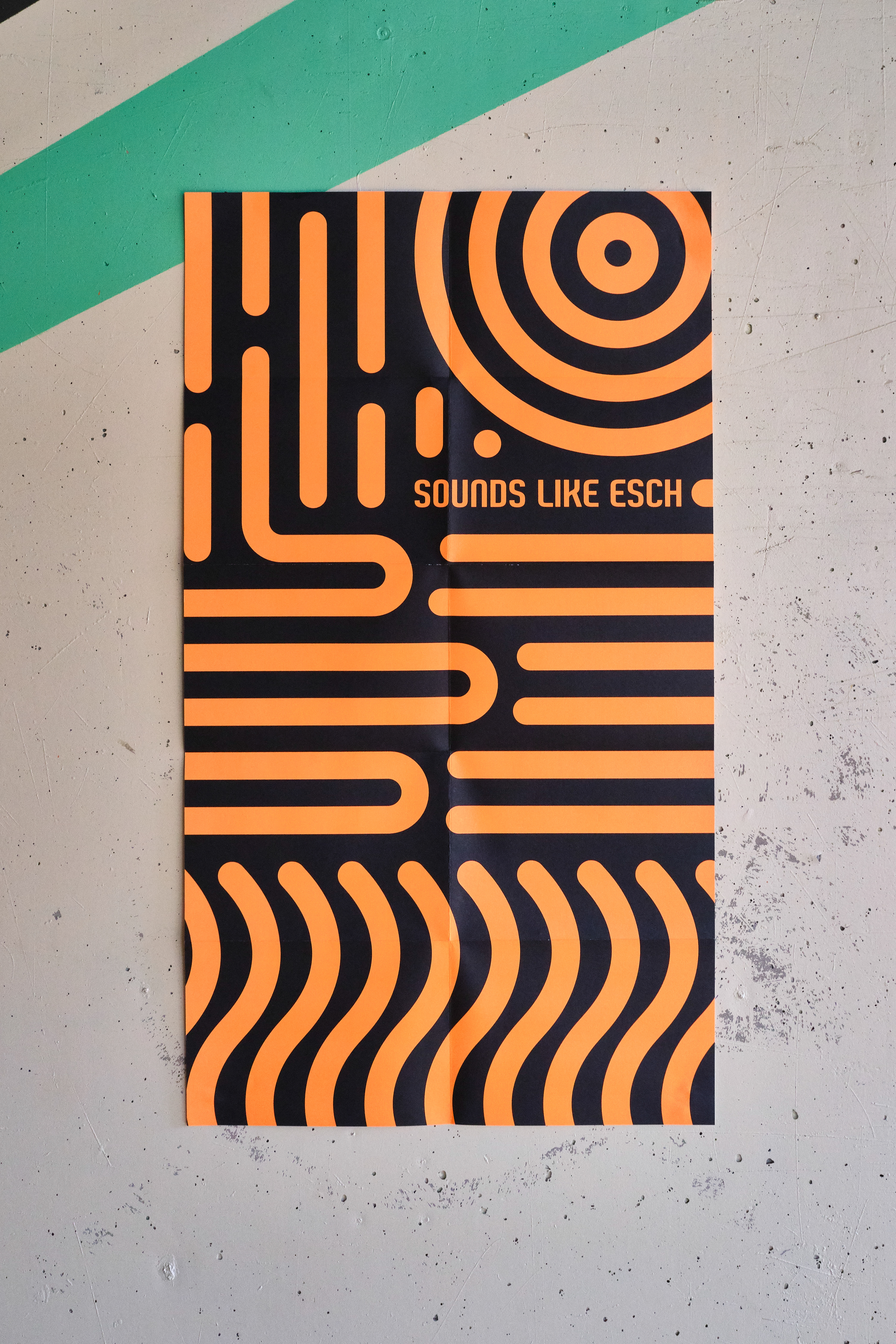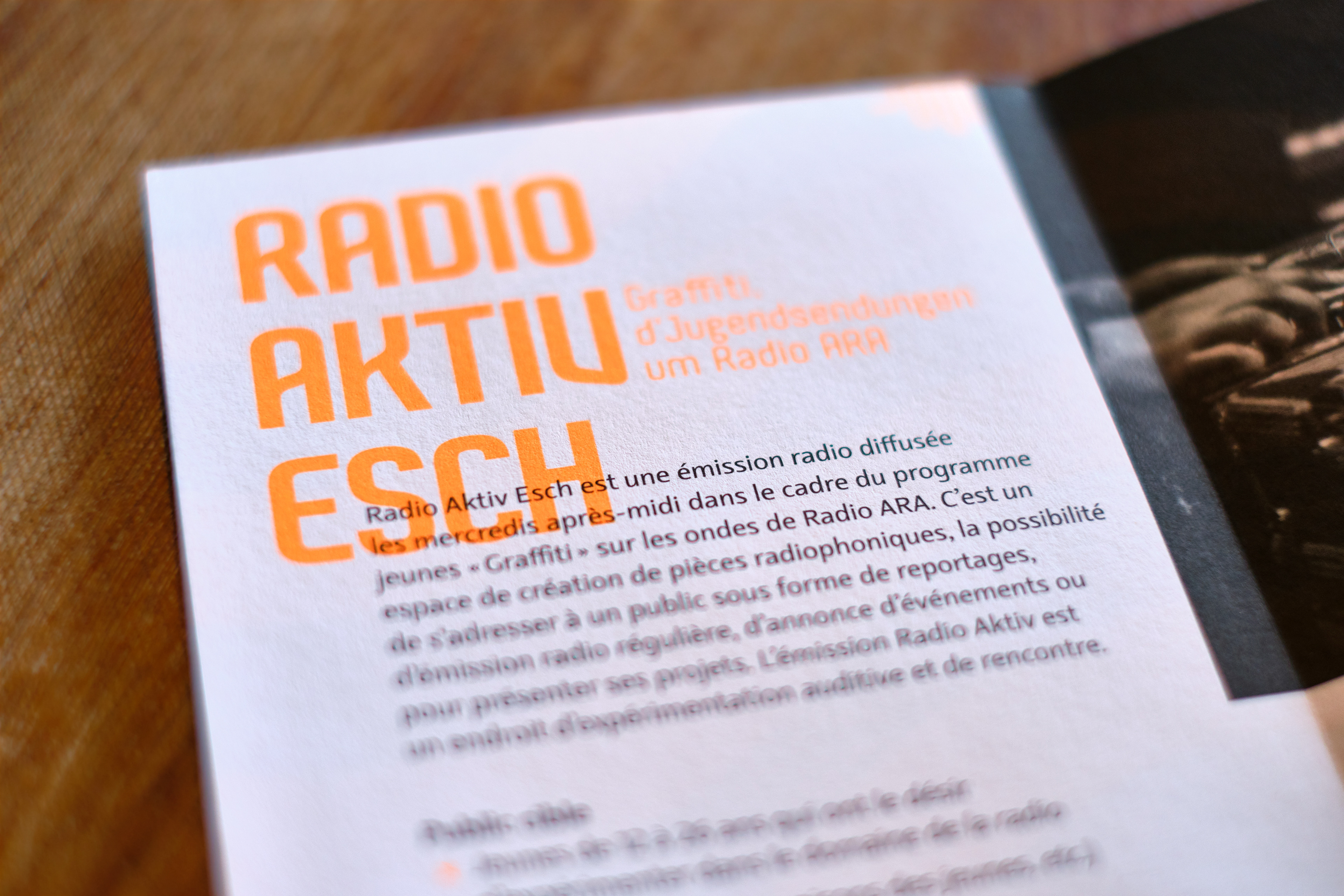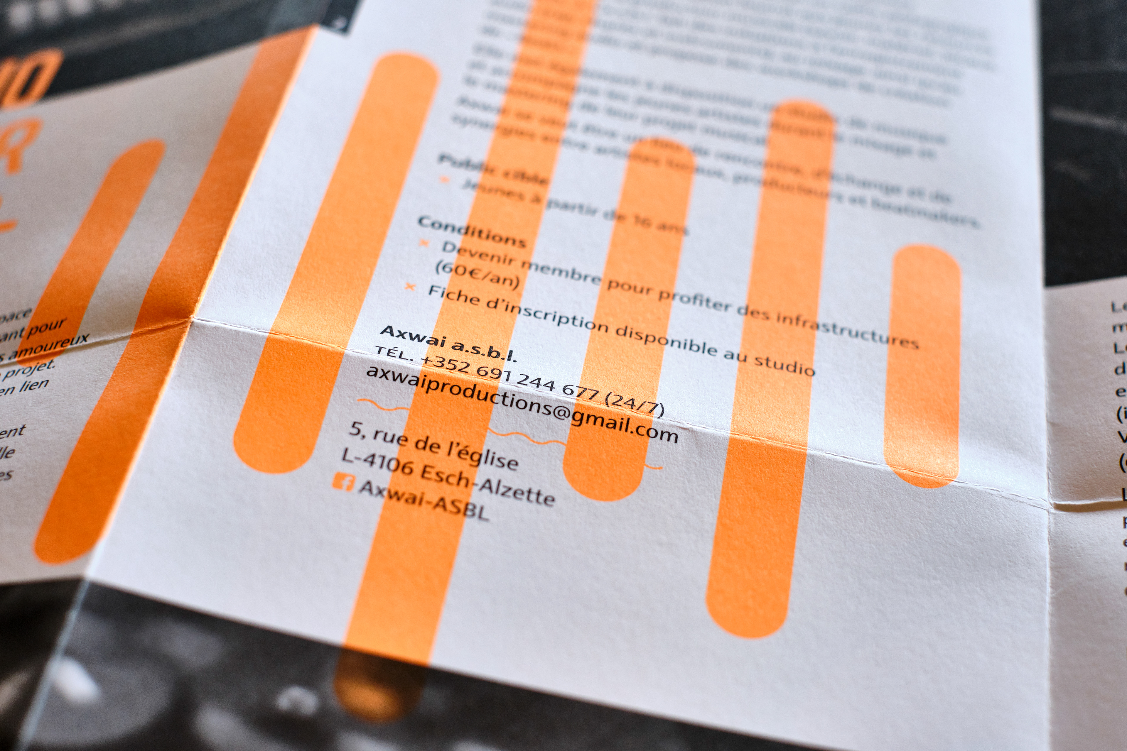 Foldout leaflet for the youth of Esch-Alzette showing the different sound production opportunities the city is offering. Information on one side, poster on the other side.