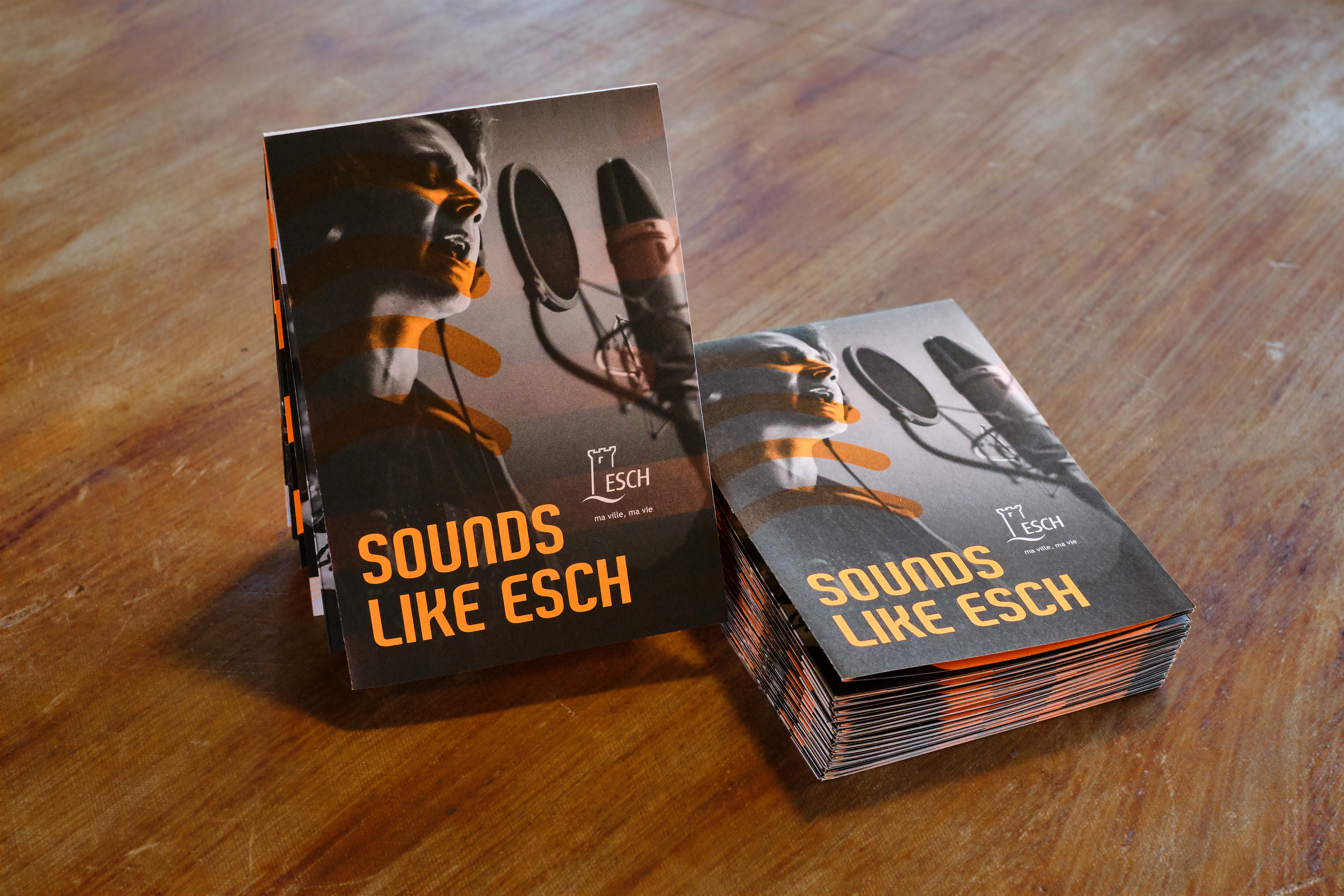 Foldout leaflet for the youth of Esch-Alzette showing the different sound production opportunities the city is offering. Information on one side, poster on the other side. Sacha was lucky to be able to use two of his own fonts on this project, Aldo Pro and Arlonne Sans Pro.