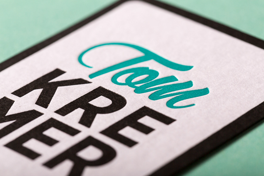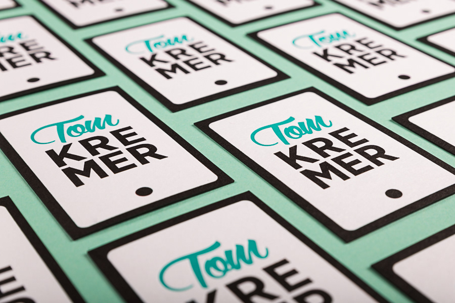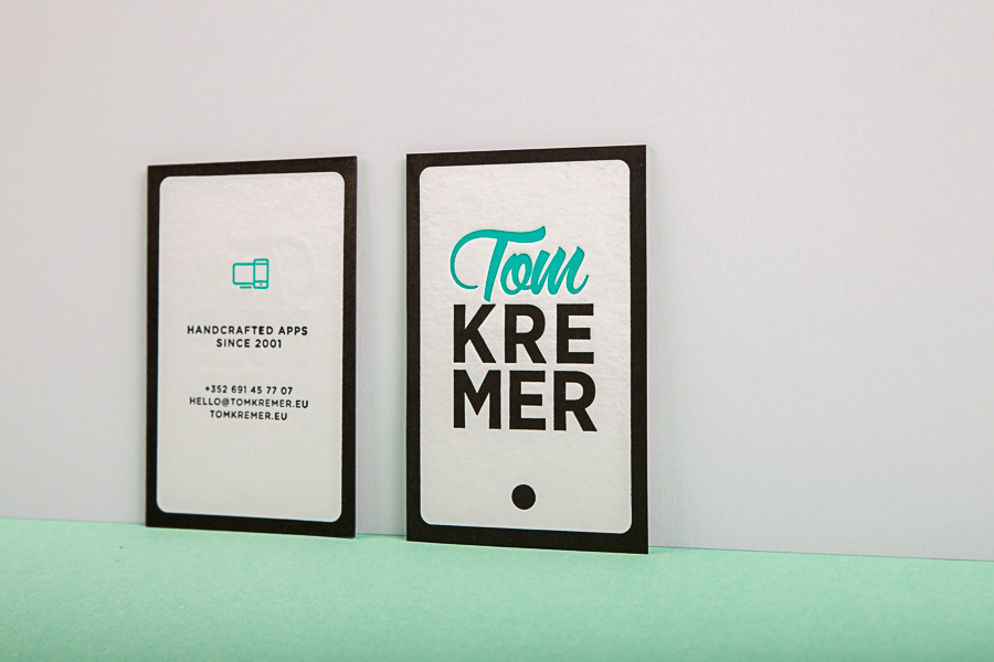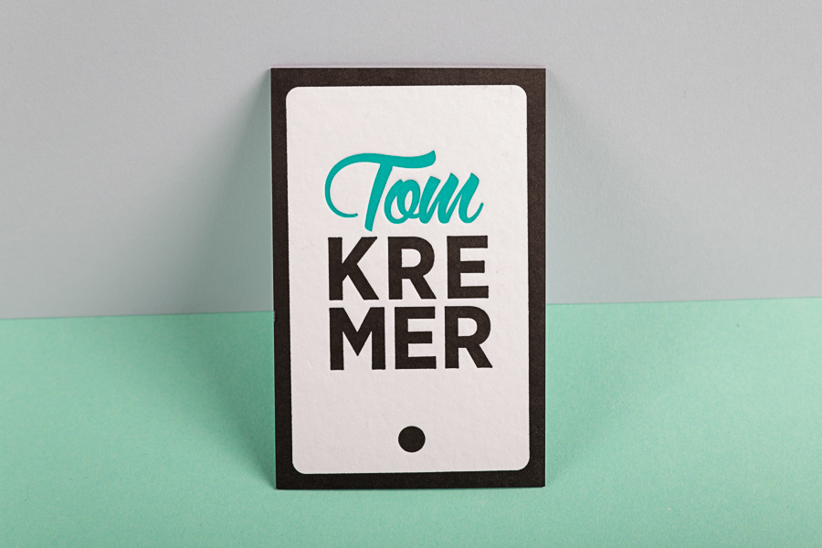 Business cards are printed in “Letterpress” on polar white paper and framed with edge painting. The Logo is designed for Tom Kremer an independent app and web developer. The sleek design and low-key shape, reminiscent of a smart phone, makes them recognisable.